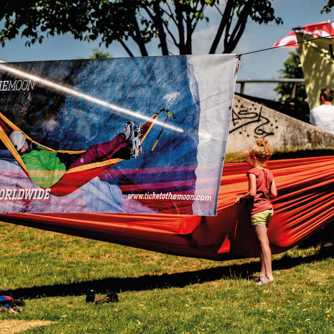 Besucher des Munich Mash können in unseren Hängematten liebend gerne chillen. Damit die Athleten auch Höchstleistungen bieten, stellen wir auch Hängematten in der Riders Lounge aus.